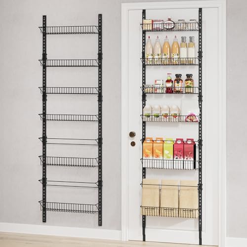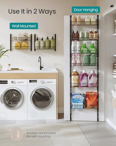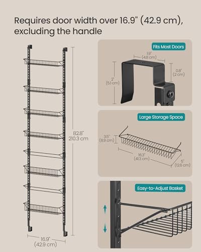SONGMICS Over-the-Door Pantry Organizer, 6-Tier Pantry Organizers and Storage, Spice Rack, 6 Adjustable Baskets, Fits Door Height 77.3-83.4 Inches, Holds 88 lb, Wall Mounted, Ink Black UKCS047B01